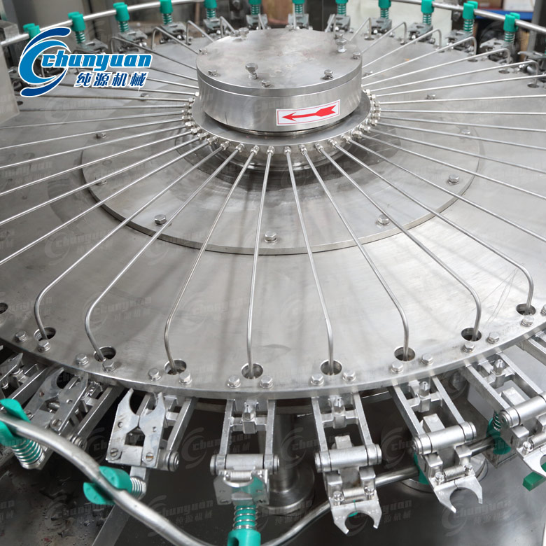 瓶子由通過風(fēng)送道傳遞,然后通過撥瓶星輪傳送至三合一機(jī)的沖瓶機(jī)。沖瓶機(jī)回轉(zhuǎn)盤上裝有瓶夾,瓶夾夾住瓶口沿一導(dǎo)軌翻轉(zhuǎn)180°,使瓶口向下。在沖瓶機(jī)特定區(qū)域,沖瓶夾噴嘴噴出沖瓶水,對(duì)瓶子內(nèi)壁進(jìn)行沖洗。瓶子經(jīng)沖洗、瀝干后在瓶夾夾持下沿導(dǎo)軌再翻轉(zhuǎn)180°,使瓶口向上。洗凈后的瓶子通過撥瓶星輪由沖瓶機(jī)導(dǎo)出并傳送至