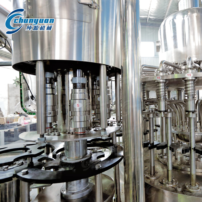 純源機(jī)械廠家生產(chǎn)制造的藍(lán)莓汁飲料機(jī)械集沖洗、灌裝、旋蓋于一體,主要適用于藍(lán)莓汁、葡萄汁、果汁、果蔬汁、橙汁、酵素等的熱灌裝。全自動果蔬汁飲料機(jī)械配有完善的溫度控制系統(tǒng)和回流系統(tǒng),設(shè)有完善的自動清洗系統(tǒng)及控制程序,與液體接觸的零件全部使用優(yōu)質(zhì)不銹鋼材料及食品級橡膠。