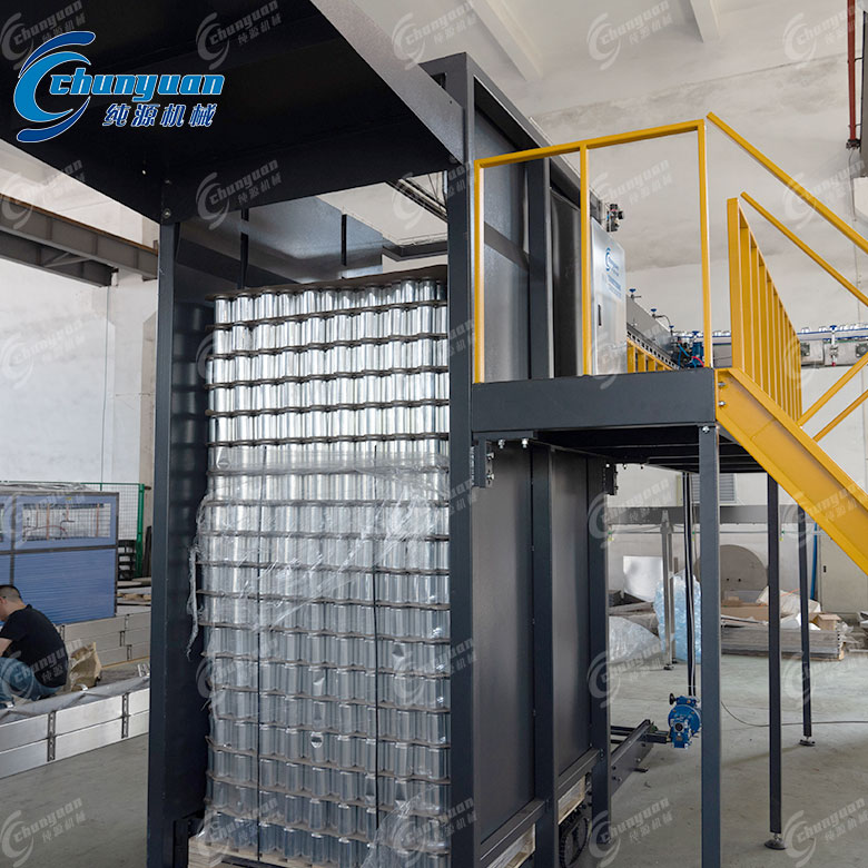 易拉罐卸垛設(shè)備通過特定的機械結(jié)構(gòu),將堆疊于棧板上的空罐,由下而上一層層的提升并推至輸送機上。整個過程由自鎖式升降系統(tǒng)裝置控制,能單獨調(diào)整上升或下降的速度,以適應(yīng)不同的操作需求???。卸罐動作通常由電機帶動鏈輪、鏈條裝置進(jìn)行,整層的空罐被推至網(wǎng)式輸送機上,然后回歸至準(zhǔn)備位置,繼續(xù)將下一層推出???。