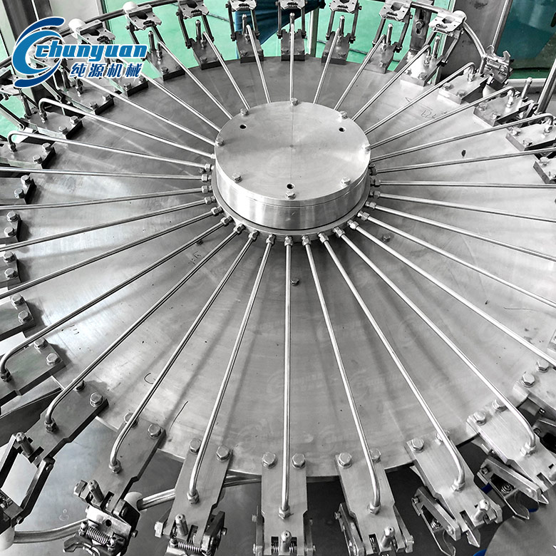洗凈后的瓶子通過撥瓶星輪由沖瓶機導(dǎo)出并傳送至小瓶裝三合一純凈水設(shè)備。進入灌裝機的瓶子由瓶頸托板卡住并在凸輪作用下將瓶子上升,然后由瓶口將灌裝閥頂開。灌裝采用重力灌裝方式。灌裝閥打開后物料通過灌裝閥完成灌裝過程,灌裝結(jié)束后瓶口下降離開灌裝閥,瓶子通過卡瓶頸過渡撥輪進入旋蓋機。